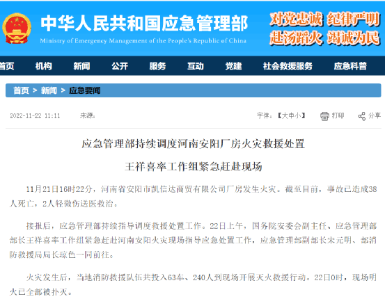 11月21日16時(shí)22分,河南省安陽市文峰區(qū)(高新區(qū))寶蓮寺鎮(zhèn)平原路凱信達(dá)商貿(mào)有限公司發(fā)生火災(zāi)。據(jù)應(yīng)急管理部消息,截至11月22日11時(shí),事故共造成38人死亡,89人成功逃生。
