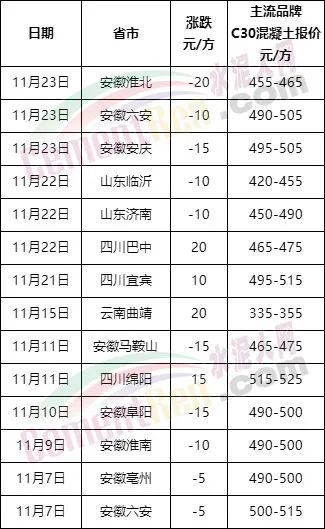 如云南曲靖市場,主要品牌混凝土價(jià)格在11月15日通知上調(diào)20元/噸,市場報(bào)價(jià)335-355元/方,仍處于較低位。陜西市場,11月22日混凝土均價(jià)454元/方,年同比下跌53元/方,跌幅達(dá)到10.52%,較上周下跌2元/方,環(huán)比下跌0.78%,整體市場報(bào)價(jià)偏弱運(yùn)行。
