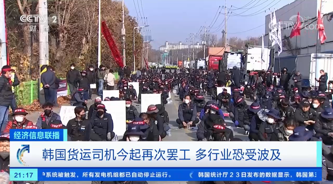 其實(shí),早在11月14日,韓國最大的工會組織之一民主勞動組合總聯(lián)盟旗下貨運(yùn)卡車工會(Cargo Truckers Solidarity)就宣布,將從11月23日午夜開始發(fā)動無限期罷工,大約2.5萬多名工會成員將通過封鎖鋼鐵、水泥、造船設(shè)備、汽車零部件等主要物流基地以及拒絕貨物運(yùn)輸?shù)确绞絽⒓恿T工。