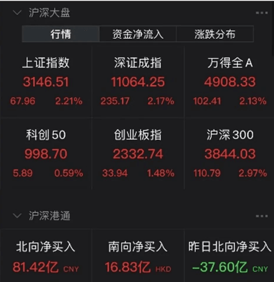 截至上午收盤(pán),上證指數(shù)上漲2.21%,深證成指上漲2.17%,創(chuàng)業(yè)板指上漲1.48%。北向資金凈流入81.42億元。港股也暴漲,恒生科技指數(shù)上午收盤(pán)大漲5.45%,重回3600點(diǎn),恒指、國(guó)指分別漲3.85%和4.72%。富時(shí)A50期指盤(pán)中漲超4%。
