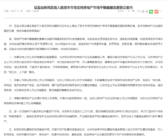11月28日,證監(jiān)會(huì)新聞發(fā)言人表示,證監(jiān)會(huì)決定在股權(quán)融資方面調(diào)整優(yōu)化5項(xiàng)措施,并自即日起施行。包括恢復(fù)涉房上市公司并購(gòu)重組及配套融資、恢復(fù)上市房企和涉房上市公司再融資等,這被稱(chēng)為近期利好房地產(chǎn)行業(yè)的“第三支箭”。
