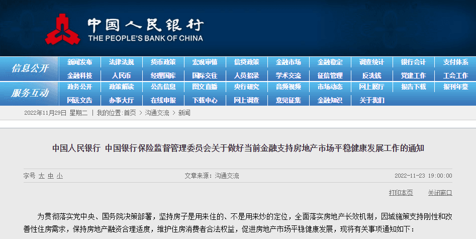 11月23日,《中國(guó)人民銀行中國(guó)銀行保險(xiǎn)監(jiān)督管理委員會(huì)關(guān)于做好當(dāng)前金融支持房地產(chǎn)市場(chǎng)平穩(wěn)健康發(fā)展工作的通知》正式發(fā)布。