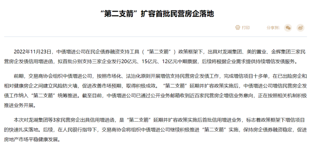 這是自11月8日交易商協(xié)會(huì)對(duì)外披露,將繼續(xù)推進(jìn)并擴(kuò)大民營(yíng)企業(yè)債券融資支持工具即“第二支箭”以來(lái),首批正式落地對(duì)民營(yíng)房企的發(fā)債支持。