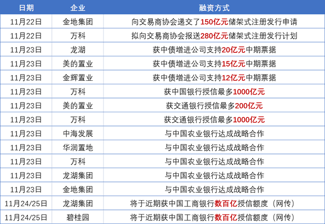 11月23日,中國(guó)銀行、農(nóng)業(yè)銀行和交通銀行先后宣布與房企簽署戰(zhàn)略合作協(xié)議,給予房企授信額度。其中,交行率先給予萬(wàn)科、美的置業(yè)分別1000億、200億授信;中國(guó)銀行給萬(wàn)科1000億授信;中國(guó)農(nóng)業(yè)銀行則一口氣與中海發(fā)展、華潤(rùn)置地、萬(wàn)科集團(tuán)、龍湖集團(tuán)、金地集團(tuán)五家房企舉行了戰(zhàn)略合作協(xié)議簽約儀式。