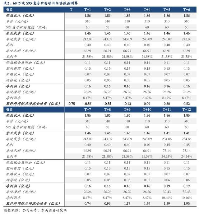 假設(shè)公司S95復(fù)合礦粉單價(jià)為310元/噸,礦粉銷售規(guī)模60萬噸時(shí),預(yù)計(jì)全年貢獻(xiàn)營業(yè)收入1.86億元,凈利潤1575萬元,毛利率21.58%,凈利率8.47%,稅后內(nèi)部回報(bào)率26.59%,具備較好的經(jīng)濟(jì)效益。同時(shí),我們根據(jù)公司已披露的營業(yè)成本拆分里可以看到預(yù)計(jì)單噸成本在243.09元/噸,其中原材料、燃料及動力費(fèi)、折舊攤銷費(fèi)、工資及福利費(fèi)、修理費(fèi)占比分別達(dá)74%、20%、4%、1%、1%。