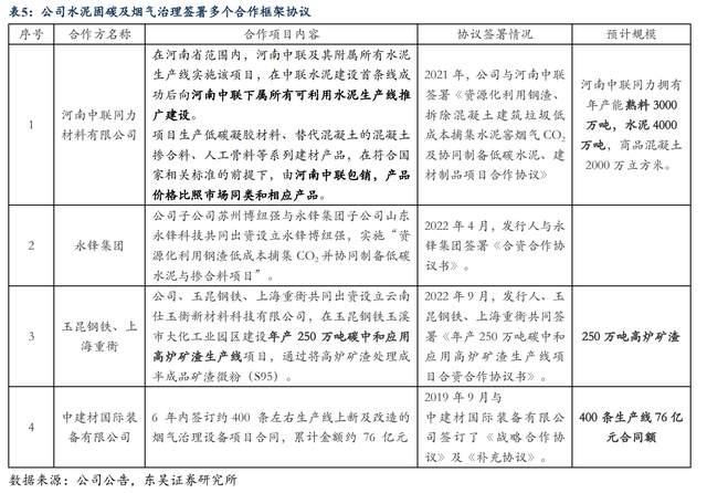 2021年公司與中聯(lián)水泥的母公司河南中聯(lián)同力材料有限公司簽訂合作協(xié)議,約定項(xiàng)目生產(chǎn)低碳膠凝材料(用于生產(chǎn)低碳水泥)、替代混凝土的混凝土摻合料、人工骨料等系列建材產(chǎn)品,在符合國家相關(guān)標(biāo)準(zhǔn)的前提下,由河南中聯(lián)同力材料有限公司包銷,且在首條中聯(lián)水泥生產(chǎn)線成功運(yùn)行后向河南中聯(lián)下屬所有可利用水泥生產(chǎn)線進(jìn)行推廣建設(shè),據(jù)河南中聯(lián)官網(wǎng)數(shù)據(jù)顯示,目前河南中聯(lián)同力擁有年產(chǎn)能熟料3000萬噸,中聯(lián)水泥首條合作水泥熟料生產(chǎn)線產(chǎn)能為4500t/d,可見若復(fù)制至河南中聯(lián)所有生產(chǎn)線潛在空間較大。