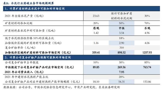 考慮公司光伏主業(yè)景氣度上行,水泥固碳項(xiàng)目進(jìn)展順利,我們測算在礦粉添加比例50%背景下,公司復(fù)合礦粉產(chǎn)品若實(shí)現(xiàn)10%、30%、85%市占率時(shí)對應(yīng)的市場空間分別達(dá)89.85、269.56、763.74億元,為公司2021年?duì)I業(yè)收入的11、34、96倍,潛在成長空間較大。