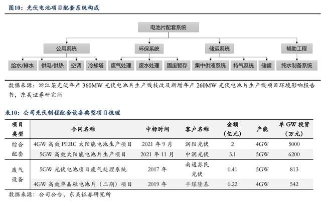 公司于2021年9月和11月接連落地兩個(gè)光伏電池綜合配套系統(tǒng)的大單,其單GW價(jià)值量分別達(dá)到5000萬元及6200萬元。兩個(gè)大單的落地驗(yàn)證了公司向一體化綜合配套設(shè)備模式轉(zhuǎn)變的能力,從公司典型項(xiàng)目合同金額來看,單一的廢氣設(shè)備單GW投資金額約500~800萬元,綜合配套設(shè)備系統(tǒng)單GW投資金額約5000~6000萬元,則公司在從廢氣設(shè)備向一體化配套設(shè)備轉(zhuǎn)型過程中單位價(jià)值體量提升空間可達(dá)5~11倍。