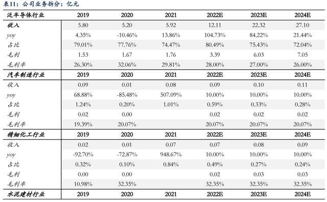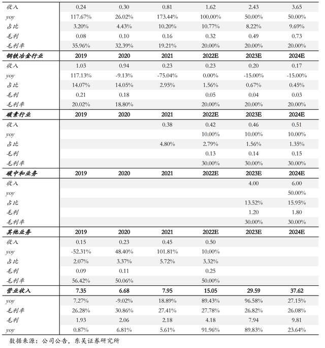 占總收入比重較小,假設(shè)鋼鐵行業(yè)2022-2024年收入增速為0%/-15%/-15%,假設(shè)碳素行業(yè)2022-2024年收入增速為10%/10%/10%,假設(shè)汽車制造、精細(xì)化工及其他行業(yè)2022-2024年收入增速維持10%左右增速,毛利率與過去三年趨勢保持一致