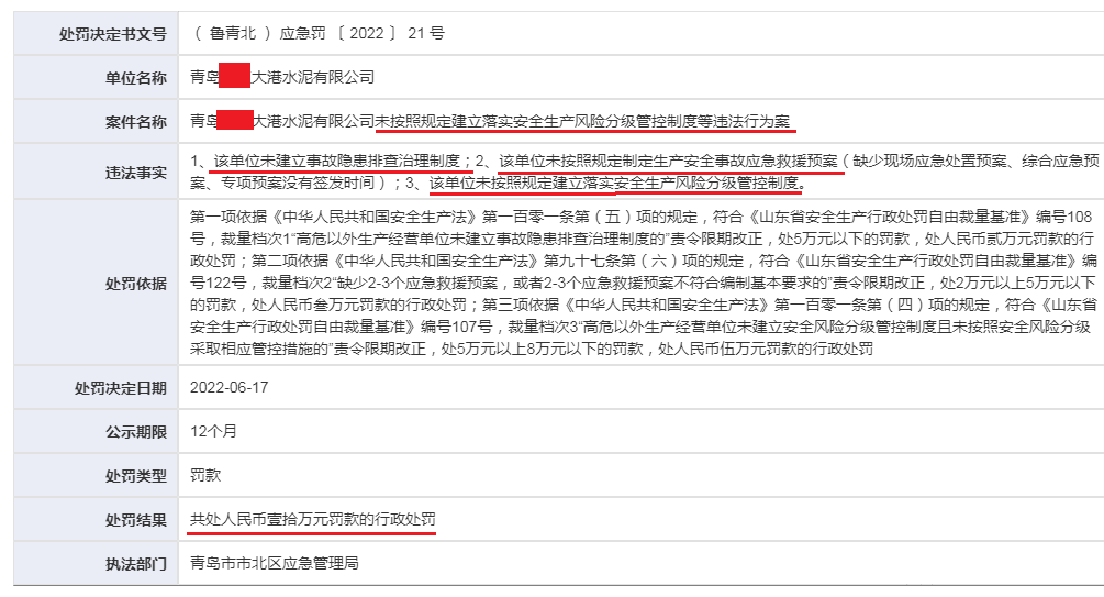 據(jù)青島市市北區(qū)應(yīng)急管理局的處罰決斷書,對青島某水泥有限公司未按照規(guī)定建立生產(chǎn)風險分級管控制度等行業(yè)案作出罰款10萬元的行政處罰。