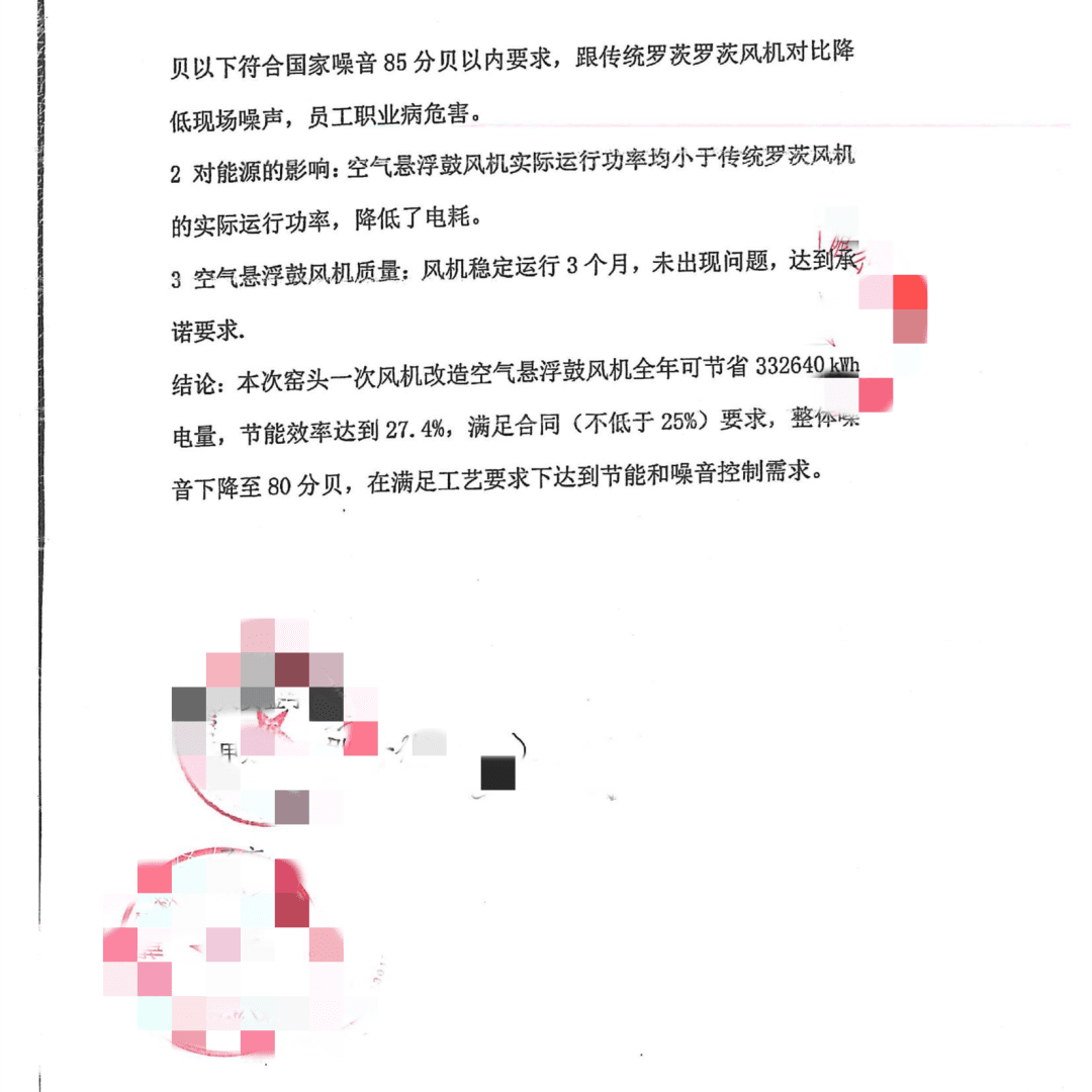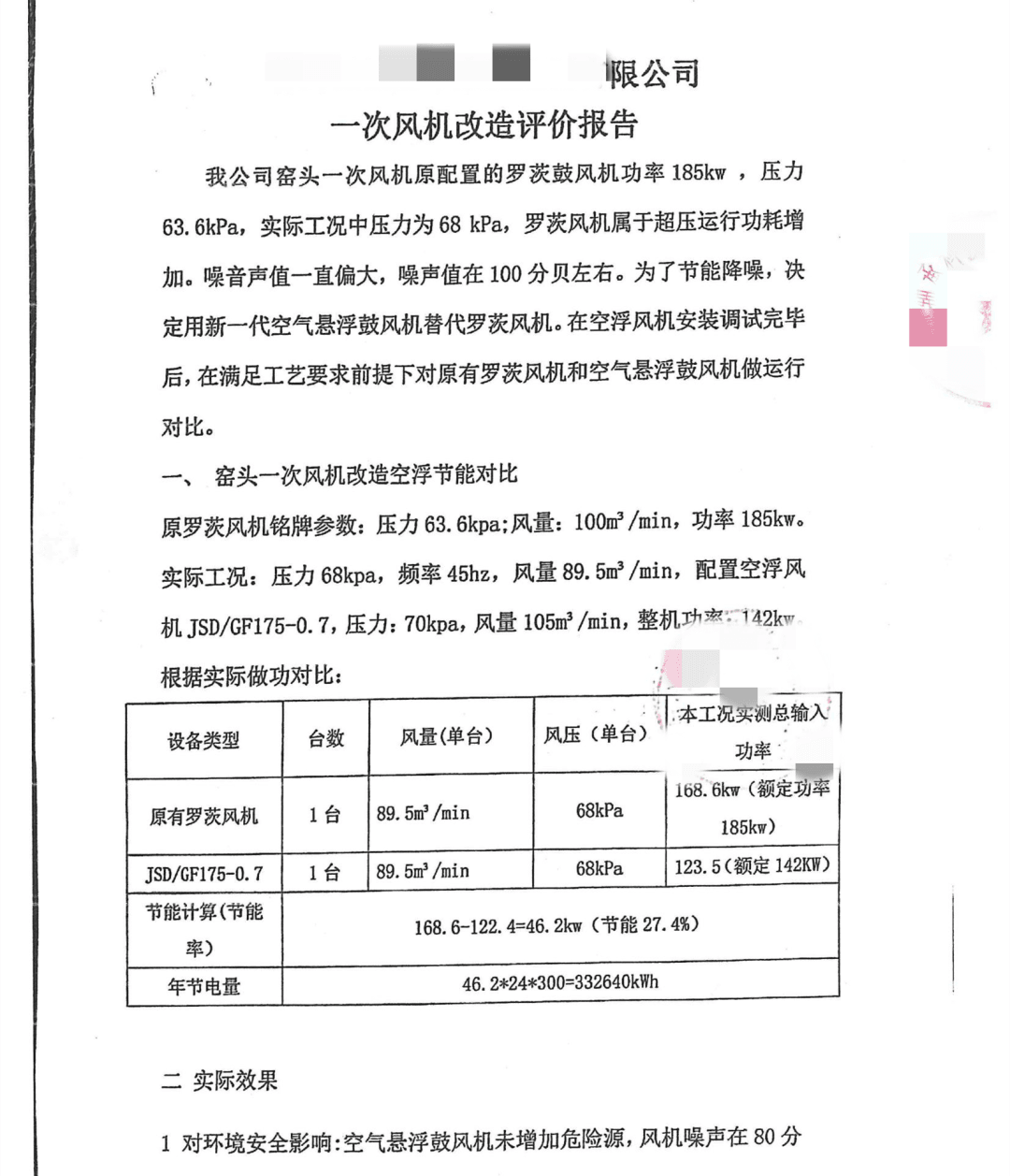 本次窯頭一次風(fēng)機(jī)改造空氣懸浮鼓風(fēng)機(jī)全年可節(jié)省332640kwh電量,節(jié)能效率達(dá)到27.4%,滿足合同(不低于25%)要求,整體噪音下降至80分貝,在滿足工藝要求下達(dá)到了節(jié)能和噪音控制需求。改造報(bào)告如下: