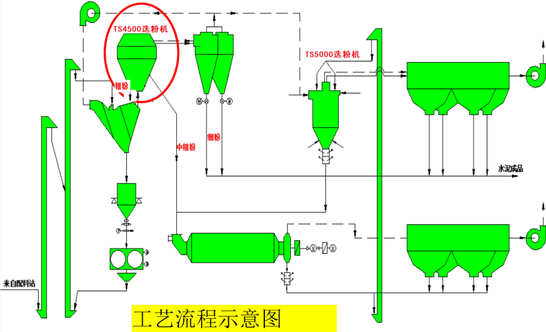 蘇州天山水泥生產(chǎn)工藝流程配置為4.2*13M管磨機+180*120輥壓機+TS4500雙轉(zhuǎn)籠選粉機,首先將各原材料按照一定配比通過電子皮帶秤計量混合后送至配料提升機,除鐵后進(jìn)入循環(huán)提升機,提升至V型選粉機進(jìn)行選粉,粗顆粒回恒重倉緩沖后進(jìn)入輥壓機中碾壓,碾壓擠碎后通過循環(huán)提升機帶至V型選粉機,V型選粉機粗選出的較細(xì)物料進(jìn)入TS4500選粉下轉(zhuǎn)籠初選,200um以上的顆粒通過下轉(zhuǎn)籠選粉后回恒重倉,小于200um的顆粒進(jìn)入TS4500選粉機上轉(zhuǎn)籠再次進(jìn)行選粉,合格品通過旋風(fēng)筒收集送入成品斜槽與磨機成品進(jìn)行混合,不合格品進(jìn)入球磨機進(jìn)行粉磨,球磨機粉磨后的物料通過出磨提升機提升至TS5000選粉機選粉,合格品通過系統(tǒng)風(fēng)機帶入收塵系統(tǒng)收集后進(jìn)入成品斜槽與TS4500成品混合,最終送入水泥庫作為水泥成品儲存,不合格品回球磨機進(jìn)行再次粉磨。