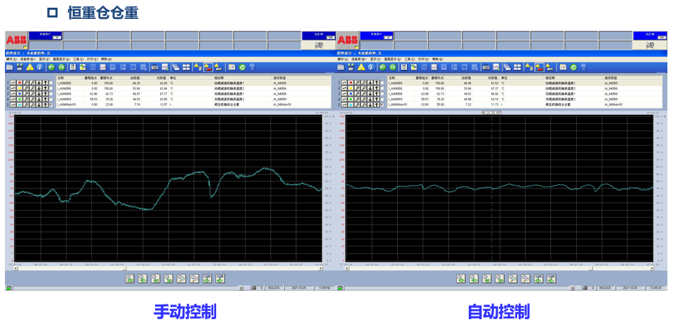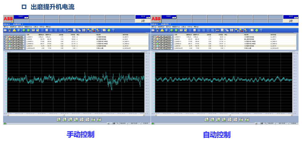 1、智能控制系統(tǒng)投運至今,實現(xiàn)自控率大于95%,輥壓機循環(huán)系統(tǒng)和磨機系統(tǒng)始終保持平衡穩(wěn)定狀態(tài),各參數(shù)波動幅度大幅度降低,水泥生產(chǎn)全智能、準(zhǔn)無人化運行,可靠實現(xiàn)了生產(chǎn)過程的連續(xù)、平穩(wěn)運行,下圖為恒重倉倉位和出磨提升機電流手動控制和自動控制趨勢對比圖。