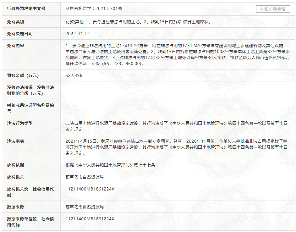 冀東水泥葫蘆島有限責(zé)任公司因未經(jīng)批準(zhǔn)非法占用楊家杖子經(jīng)濟(jì)開發(fā)區(qū)土地進(jìn)行水泥廠基礎(chǔ)設(shè)施建設(shè),違反了《土地管理法》。11月21日被葫蘆島市自然資源局一次性罰款522.396萬元。并要求其退還土地,拆除已建地面,恢復(fù)土地原狀。