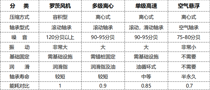 空浮風機比傳統(tǒng)羅茨風機節(jié)能25%~35%,比多級離心風機節(jié)能10%~20%,是目前最節(jié)能、最高效的高速流體設備。