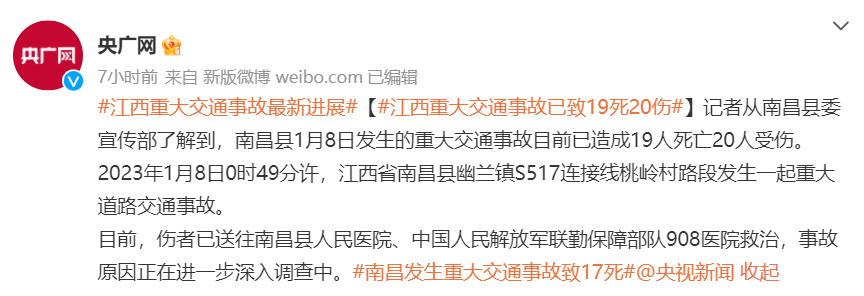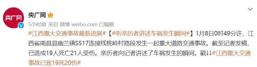 1月8日凌晨,江西南昌縣發(fā)生一起重大交通事故,截止1月9日16時,已造成19人死亡21人受傷。當?shù)鼐用裢嘎?,因逝者家屬需早?點前到殯儀館排隊拿號,故村民于凌晨出殯,后被貨車撞上送行隊伍造成死傷。
