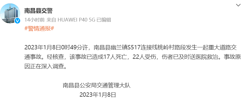 當?shù)鼐用裉峁┑墓俜酵▓蠓Q,2023年1月8日0時50分,在南昌縣幽蘭鎮(zhèn)桃?guī)X村紅溪章家自然村發(fā)生一起重大交通事故,一輛重型半掛牽引車(屬于樂平某物流公司),撞上出殯隊伍,初步掌握,事故已造成17人死亡、22人受傷,傷者已送往醫(yī)院搶救,車輛核載質量32700KG,車輛裝載砂石。
