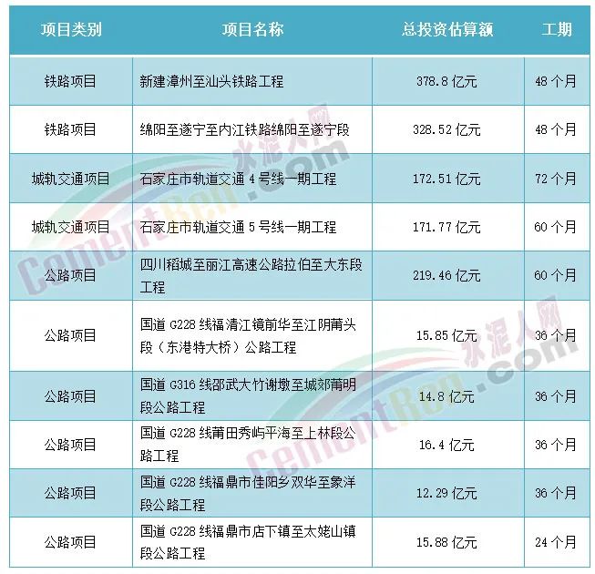 據(jù)水泥人網(wǎng)了解,近日,有多個(gè)重大項(xiàng)目獲批,其中包括多個(gè)鐵路、城軌交通、公路等項(xiàng)目,項(xiàng)目總投資額達(dá)1300多億元,其中部分項(xiàng)目中標(biāo)單位已經(jīng)確定中鐵建下屬公司。