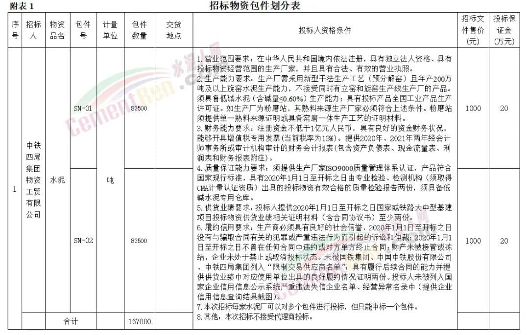 中鐵四局集團(tuán)有限公司深江鐵路五標(biāo)項(xiàng)目167000噸水泥采購招標(biāo)公告中明確投標(biāo)人生產(chǎn)能力要求生產(chǎn)廠需采用新型干法生產(chǎn)工藝(預(yù)分解窯)且年產(chǎn)200萬噸及以上旋窯水泥生產(chǎn)能力,不接受同時(shí)有立窯和旋窯生產(chǎn)線生產(chǎn)廠的產(chǎn)品。須具備低堿水泥(含堿量≤0.60%)生產(chǎn)能力;具有投標(biāo)產(chǎn)品全國工業(yè)產(chǎn)品生產(chǎn)許可證。如生產(chǎn)廠為粉磨站,其熟料來源生產(chǎn)廠家必須符合上述條件。粉磨站須提供單一熟料來源證明或具備窯磨一體生產(chǎn)工藝的證明材料,企業(yè)須具備低堿水泥專用倉庫。