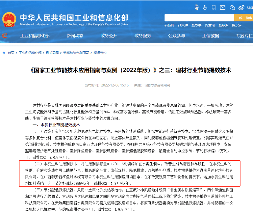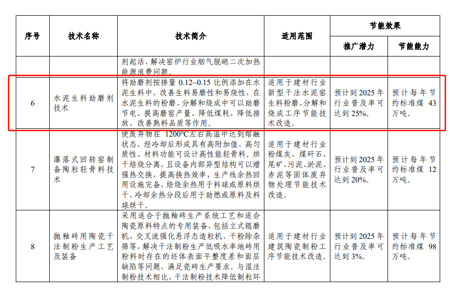 為加快推廣應(yīng)用先進(jìn)適用節(jié)能技術(shù)裝備,促進(jìn)企業(yè)節(jié)能降碳、降本增效,工信部近日發(fā)布了《國家工業(yè)和信息化領(lǐng)域節(jié)能技術(shù)裝備推薦目錄(2022年版)》,湖南昌迪環(huán)境科技有限公司(以下簡稱“湖南昌迪”)申報(bào)的水泥生料助磨劑應(yīng)用技術(shù)納入建材行業(yè)節(jié)能提效技術(shù)裝備推薦。