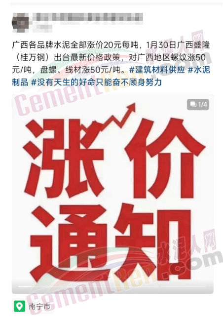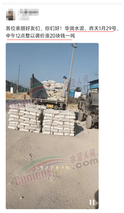 另一華潤(rùn)水泥經(jīng)銷(xiāo)商發(fā)消息確認(rèn):“華潤(rùn)水泥1月29日中午12點(diǎn)整已調(diào)價(jià)20元/噸。”