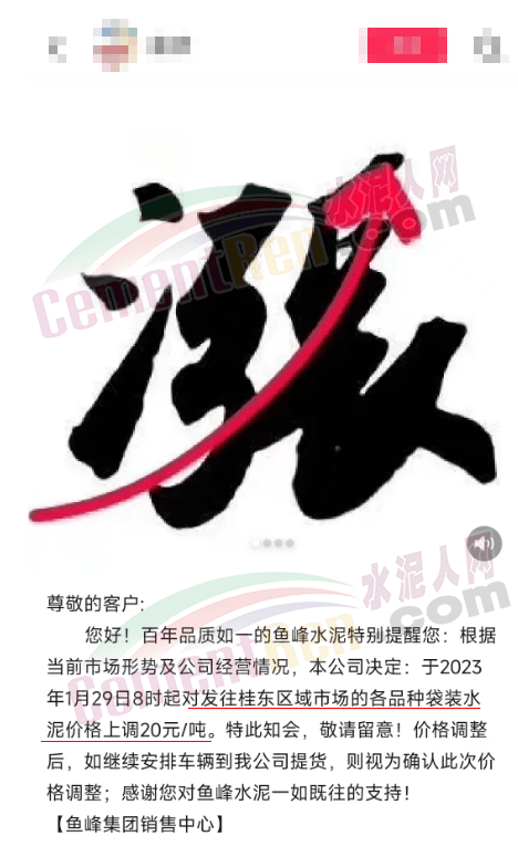 魚(yú)峰集團(tuán)經(jīng)銷(xiāo)商轉(zhuǎn)發(fā)企業(yè)銷(xiāo)售中心對(duì)發(fā)往桂東區(qū)域市場(chǎng)的各品種袋裝水泥價(jià)格上調(diào)20元/噸的通知。