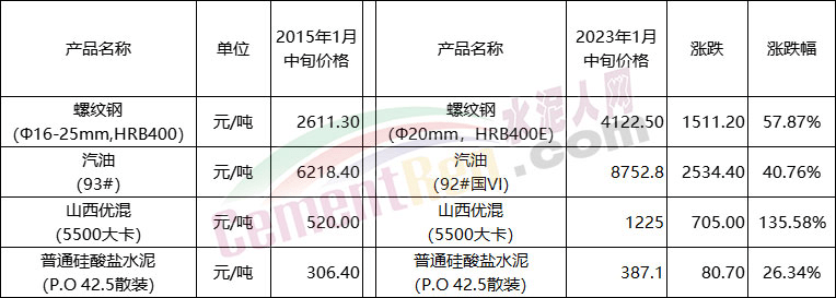 價(jià)格方面,國(guó)家統(tǒng)計(jì)局1月24日公布了2023年1月中旬流通領(lǐng)域重要生產(chǎn)資料市場(chǎng)價(jià)格變動(dòng)情況。對(duì)比2015年相關(guān)數(shù)據(jù)可見(jiàn),煤炭?jī)r(jià)格上漲了135.58%,螺紋鋼及汽油分別上漲了57.87%和40.76%,而P.O42.5散裝水泥價(jià)格僅上漲了26.34%。