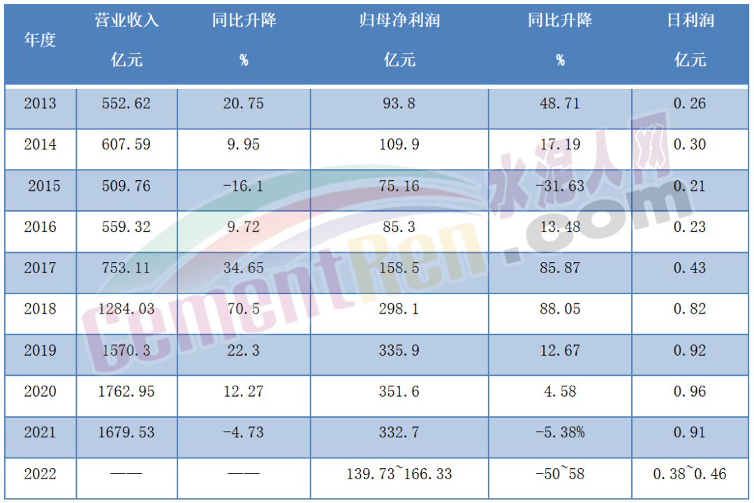 回顧海螺水泥近10年的歷史業(yè)績可見2019~2021三年間,其日賺利潤均達(dá)到9000萬以上。2017年日均利潤4300萬與2022年相當(dāng),海螺業(yè)績一夜回到五年前。