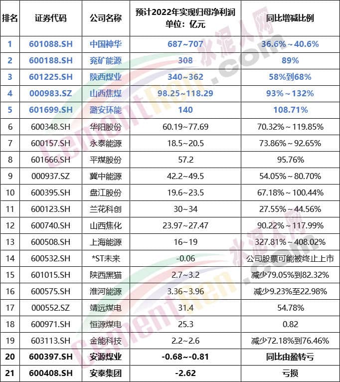 據(jù)上市公司數(shù)據(jù)顯示,截至1月30日晚間,共有21家煤炭上市企業(yè)披露2022年度業(yè)績(jī)預(yù)告,其中有中國(guó)神華、陜西煤業(yè)、兗礦能源、潞安環(huán)能、山西焦煤5家上市煤企預(yù)計(jì)2022年度凈賺上百億元,僅安源煤業(yè)、安泰集團(tuán)兩家上市煤企預(yù)計(jì)凈利潤(rùn)虧損。
