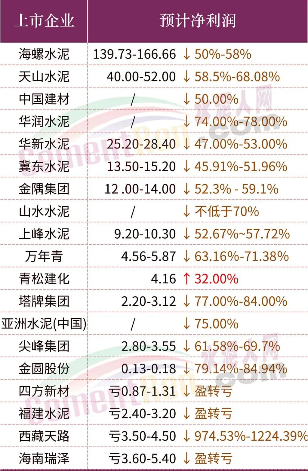 截至1月31日,19家上市建材企業(yè)公布2022年業(yè)績(jī)預(yù)告。其中, 中國(guó)建材 、 海螺水泥 、天山水泥、華潤(rùn)水泥、 華新水泥和冀東水泥等18家企業(yè)2022年凈利潤(rùn)預(yù)計(jì)下降。