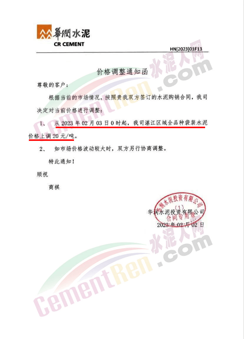 同日,華潤水泥通知根據(jù)當前的市場情況,從2月3日0時起,公司湛江區(qū)域全品種袋裝水泥上調(diào)20元/噸。