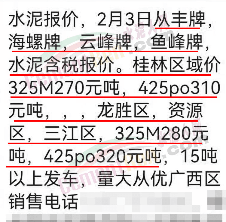 據(jù)市場反饋,華南區(qū)域節(jié)后第一波價格上調(diào)是從廣西區(qū)域開始的。廣西桂林一經(jīng)銷商通知稱,2月3日從豐牌、海螺牌、云峰牌、魚峰牌水泥含稅報價,桂林區(qū)域M32.5水泥270元/噸,P.O42.5水泥報價310元/噸。龍勝區(qū)、資源區(qū)、三江區(qū)M32.5水泥報價280元/噸,P.O42.5水泥報價320元/噸,15噸以上發(fā)車,量大從優(yōu)。