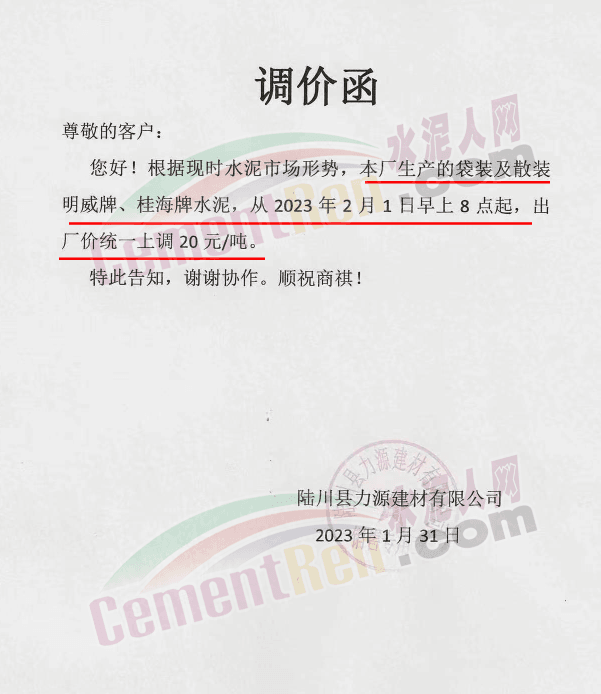 同期,陸路川縣力源建材有限公司通知稱,根據(jù)現(xiàn)時市場形勢,本廠生產(chǎn)的袋裝及散裝明威牌、桂海牌水泥從2月1日8時起,出廠價統(tǒng)一上調(diào)20元/噸。