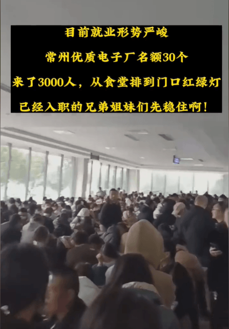 江蘇常州優(yōu)質(zhì)電子廠,招工名額30個,來了3000人,從食堂排到門口紅綠燈。
