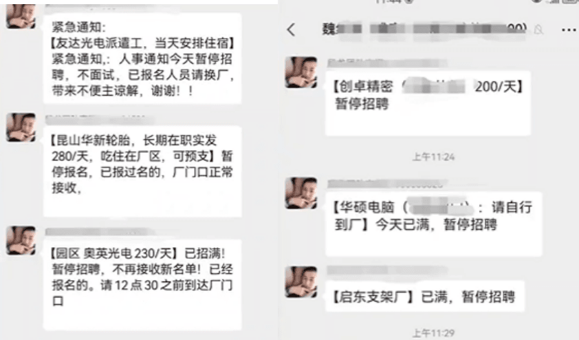 長沙比亞迪全部停招,蘋果昌碩科技暫停招募代工,蘇州立訊已經(jīng)停招,成都5大工廠(富士康、京東方、仁寶、偉創(chuàng)、捷普)基本都已“熄火”,目前現(xiàn)在廠里都飽和了,要十幾個人,都能去一百多人。