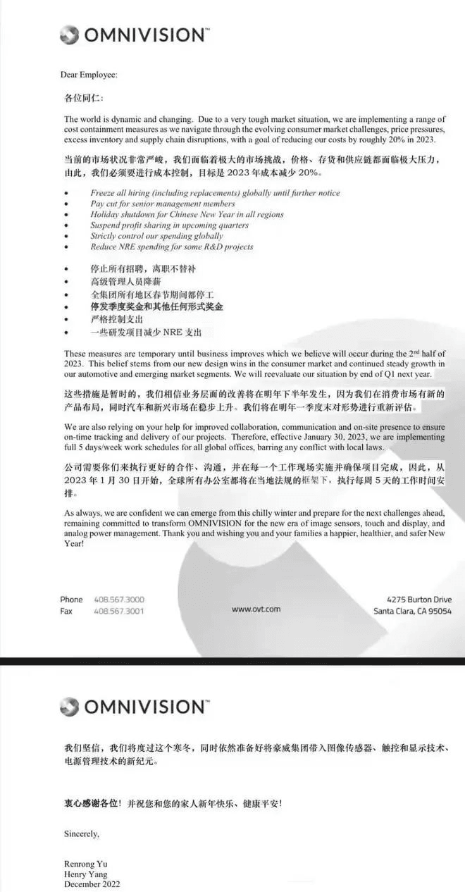 延續(xù)了近兩年的科技公司裁員潮和互聯(lián)網(wǎng)企業(yè)優(yōu)化潮仍在繼續(xù),2023年全球科技業(yè)宣布的裁員計劃總數(shù)目前已超過10萬人,接近2022年整年的裁員數(shù)量。美國芯片企業(yè)豪威集團(OmniVisionGroup)預(yù)警,2023年市場需求不樂觀,運營將面臨極大的挑戰(zhàn),宣布采用停招、降薪等一系列措施控制成本,以使明年成本減少20%,并表示這些措施是暫時的,將在明年一季度末對形勢進(jìn)行重新評估。