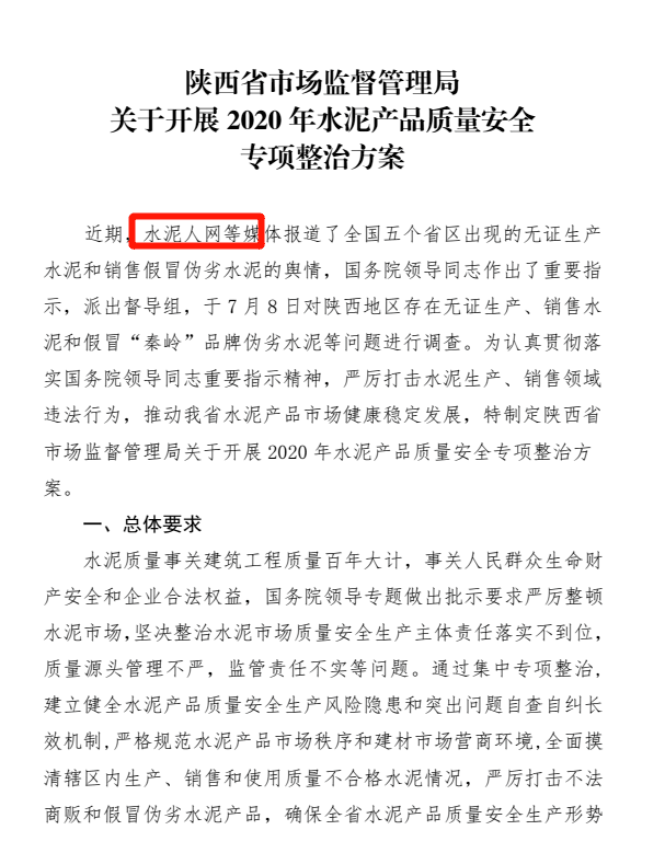 陜西省市場監(jiān)督管理局水泥產(chǎn)品質(zhì)量安全專項整治方案提到,水泥人網(wǎng)等媒體報道了全國五個省區(qū)出現(xiàn)的無證生產(chǎn)水泥和銷售假冒偽劣水泥的輿情,國務(wù)院領(lǐng)導同志作出了重要指示,派出督導組對陜西地區(qū)存在無證生產(chǎn)、銷售水泥和假冒品牌偽劣水泥等問題進行調(diào)查。為認真貫徹落實國務(wù)院領(lǐng)導同志重要指示精神,嚴厲打擊水泥生產(chǎn)、銷售領(lǐng)域違法行為,推動陜西省水泥產(chǎn)品市場健康穩(wěn)定發(fā)展,特制定水泥產(chǎn)品質(zhì)量安全專項整治方案。