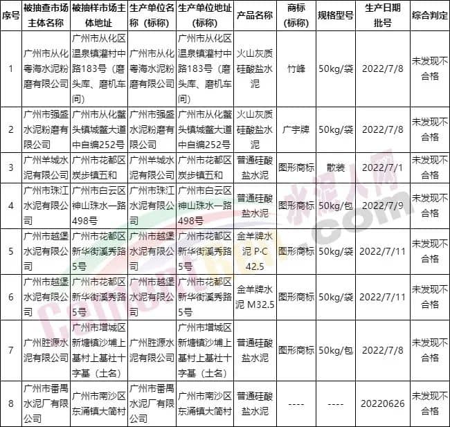 廣東省廣州市市場監(jiān)督管理局水泥產(chǎn)品質(zhì)量監(jiān)督抽查,共抽查了8批次樣品,經(jīng)檢驗全部產(chǎn)品符合標準要求。