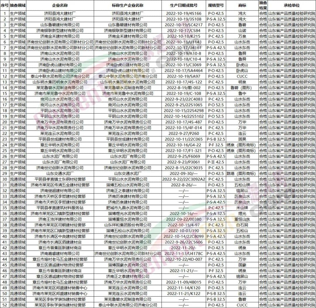 山東濟南2022年水泥產(chǎn)品質(zhì)量監(jiān)督抽查未抽到企業(yè)匯總表