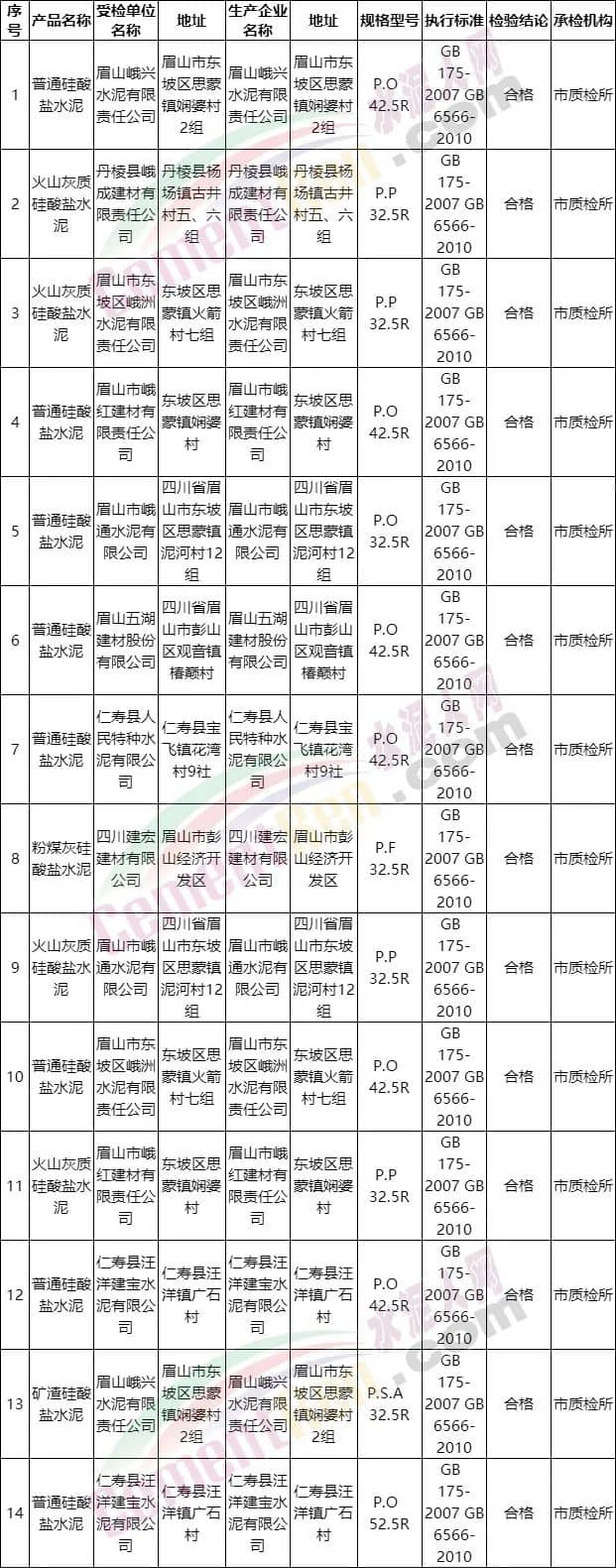 四川省眉山市市場監(jiān)督管理局第四批工業(yè)產(chǎn)品質(zhì)量市級監(jiān)督抽查共抽查水泥14批次,全部合格。