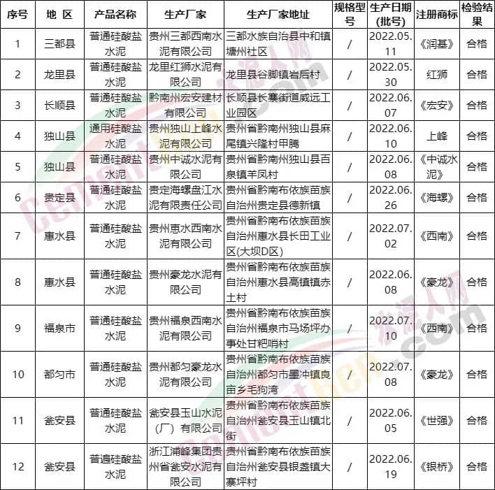 貴州省黔南州市場監(jiān)管局生產(chǎn)領(lǐng)域產(chǎn)品質(zhì)量州級監(jiān)督抽查,共抽檢12批次水泥,全部合格。