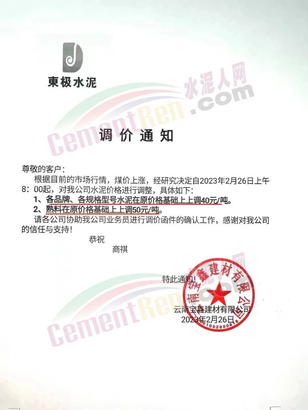 水泥人網(wǎng)通訊員消息,日前,云南寶鑫建材有限公司通知,根據(jù)目前的市場行情,煤價上漲,經(jīng)研究決定自2023年2月26日上午8起,對公司各品牌、各規(guī)格型號水泥在原價格基礎上上調(diào)40元/噸;熟料在原價格基礎上上調(diào)50元/噸。
