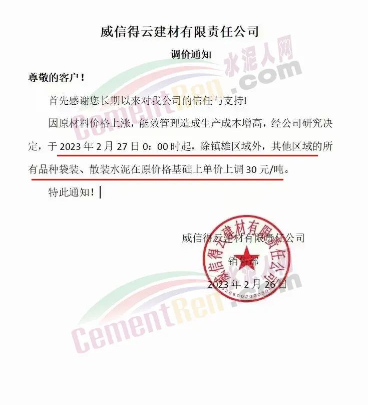 威信得云建材有限責任公司通知,因原材料價格上漲,能效管理造成生產(chǎn)成本增高,經(jīng)公司研究決定,于2023年2月27日0時起,除鎮(zhèn)雄區(qū)域外,其他區(qū)域的所有品種袋裝、散裝水泥在原價格基礎上上調(diào)30元/噸。