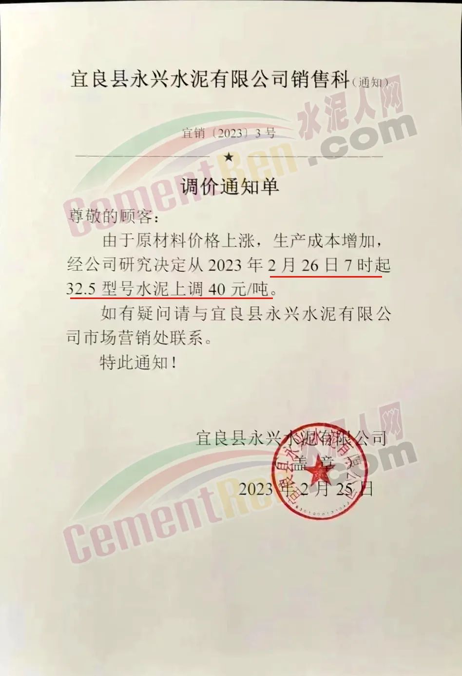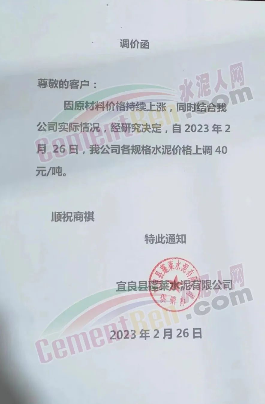 宜良縣永興水泥有限公司銷售科通知,由于原材料價格上漲,生產(chǎn)成本增加,經(jīng)公司研究決定從2023年2月26日7時起32.5型號水泥上調(diào)40元/噸。