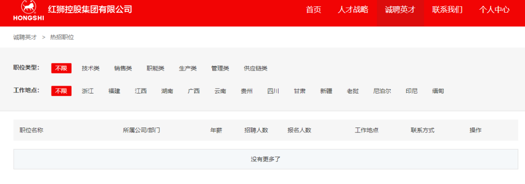 與此同時,國內(nèi)水泥行業(yè)各大企業(yè)也減少了部分崗位的招聘。紅獅集團官網(wǎng)誠聘英才欄,招聘職位“全無”。