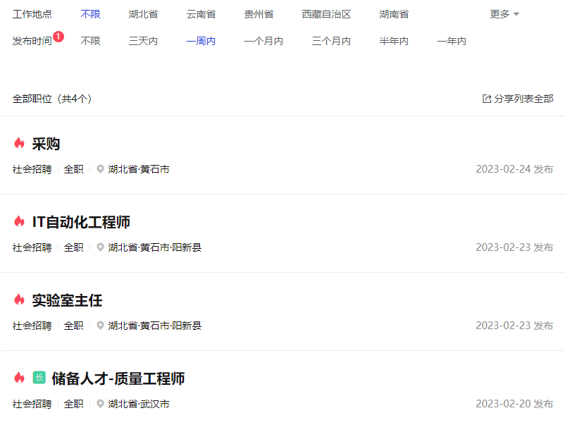 華新水泥一周內(nèi)的社會招聘也僅有湖北黃石區(qū)域的采購、IT自動化工程師、實驗室主任以及長期招聘的儲備人才質(zhì)量工程師。