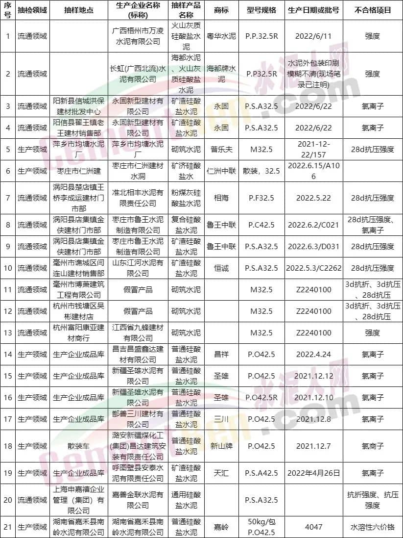 各省市地方監(jiān)督抽查21批次水泥質(zhì)量不合格,涉及強(qiáng)度和氯離子