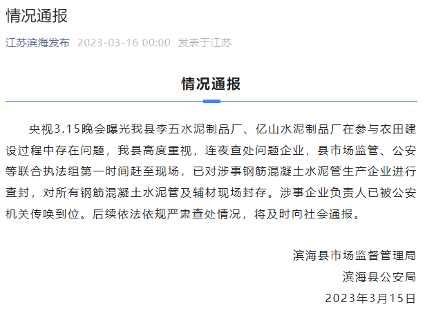 據(jù)“江蘇濱海發(fā)布”微信號16日0時消息,濱海縣市場監(jiān)督管理局、濱??h公安局通報稱,央視“3.15”晚會曝光濱??h李五水泥制品廠、億山水泥制品廠在參與農(nóng)田建設(shè)過程中存在問題,濱??h高度重視,連夜查處問題企業(yè),縣市場監(jiān)管、公安等聯(lián)合執(zhí)法組第一時間趕至現(xiàn)場,已對涉事鋼筋混凝土水泥管生產(chǎn)企業(yè)進(jìn)行查封,對所有鋼筋混凝土水泥管及輔材現(xiàn)場封存。涉事企業(yè)負(fù)責(zé)人已被公安機(jī)關(guān)傳喚到位。后續(xù)依法依規(guī)嚴(yán)肅查處情況,將及時向社會通報。