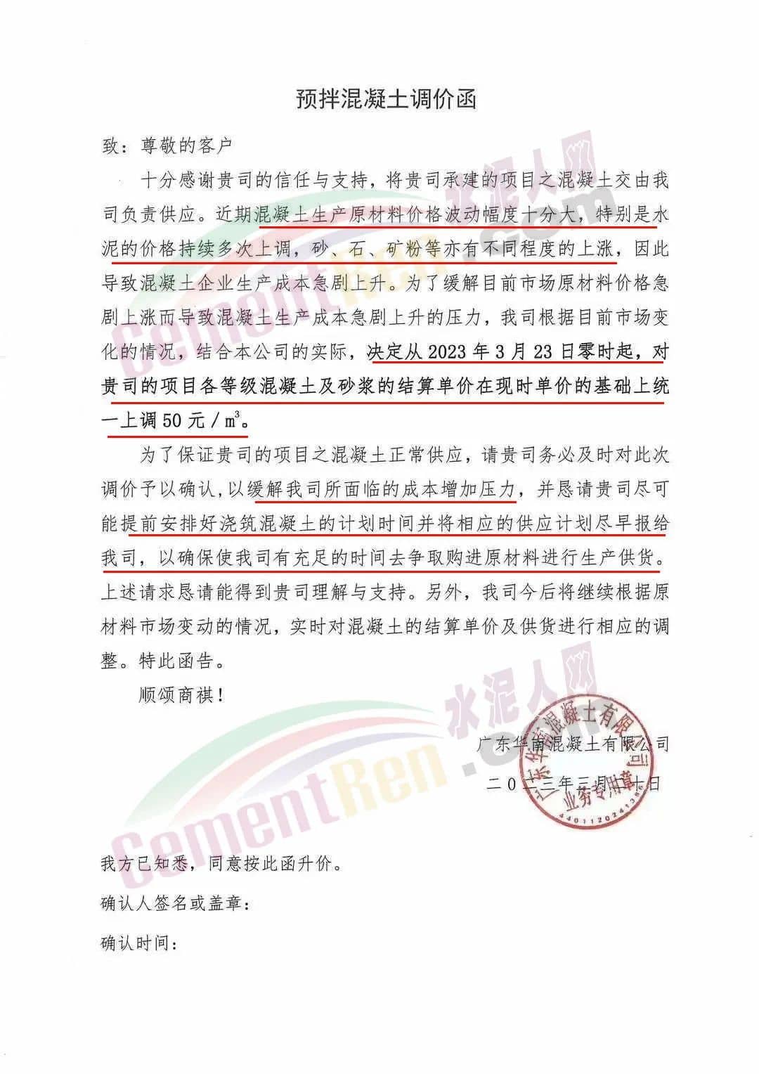廣州興業(yè)混凝土攪拌有限公司通知由于近期混凝土生產(chǎn)原材料價格上漲因素,特別是水泥的價格持續(xù)多次上調(diào),砂、石、礦粉等亦有不同程度地上漲,致使混凝土的成本增加。經(jīng)研究決定于2023年3月24日零時起對所有等級標(biāo)號混凝土(包括潤泵砂漿)上調(diào)50元/立方,請客戶在收到通知后在3天內(nèi)予以確認(rèn),并按雙方所簽訂合同的約定付清貨款,以緩解公司所面臨的資金壓力,否則,難以保證工程項(xiàng)目的正常供應(yīng)。