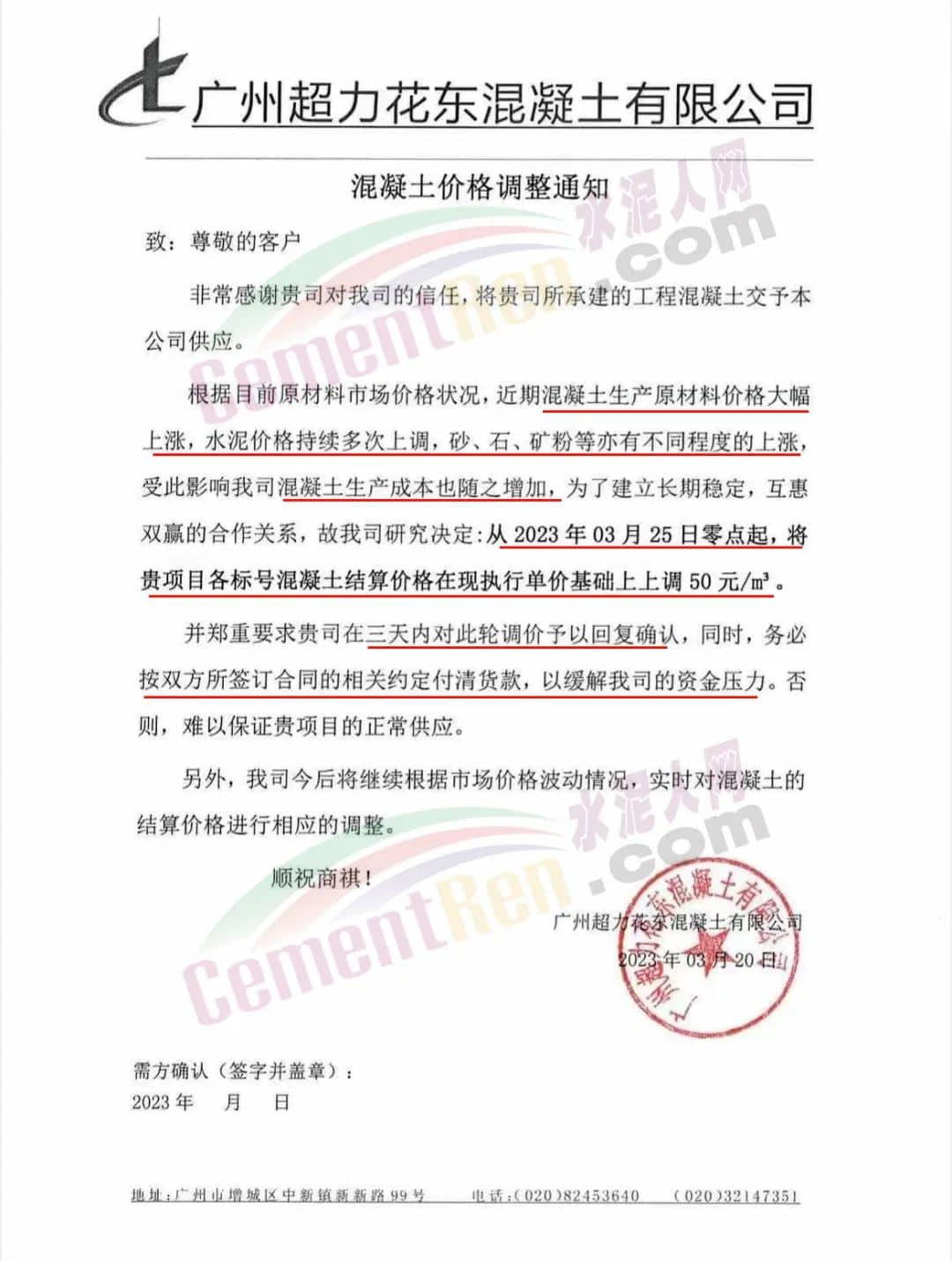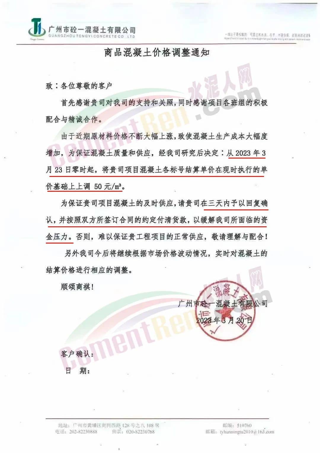 廣州市砼一混凝土有限公司通知由于近期原材料價格不斷大幅上漲,致使混凝土生產(chǎn)成本大幅度增加,為保證混凝土質(zhì)量和供應(yīng),經(jīng)公司研究后決定從2023年3月23日零時起,混凝土各標(biāo)號結(jié)算單價在現(xiàn)時執(zhí)行的單價基礎(chǔ)上上調(diào)50元/立方。為保證項(xiàng)目混凝土的及時供應(yīng),請客戶三天內(nèi)予以回復(fù)確認(rèn),并按照雙方所簽訂合同的約定付清貨款,以緩解公司所面臨的資金壓力,否則,難以保證工程項(xiàng)目的正常供應(yīng)。